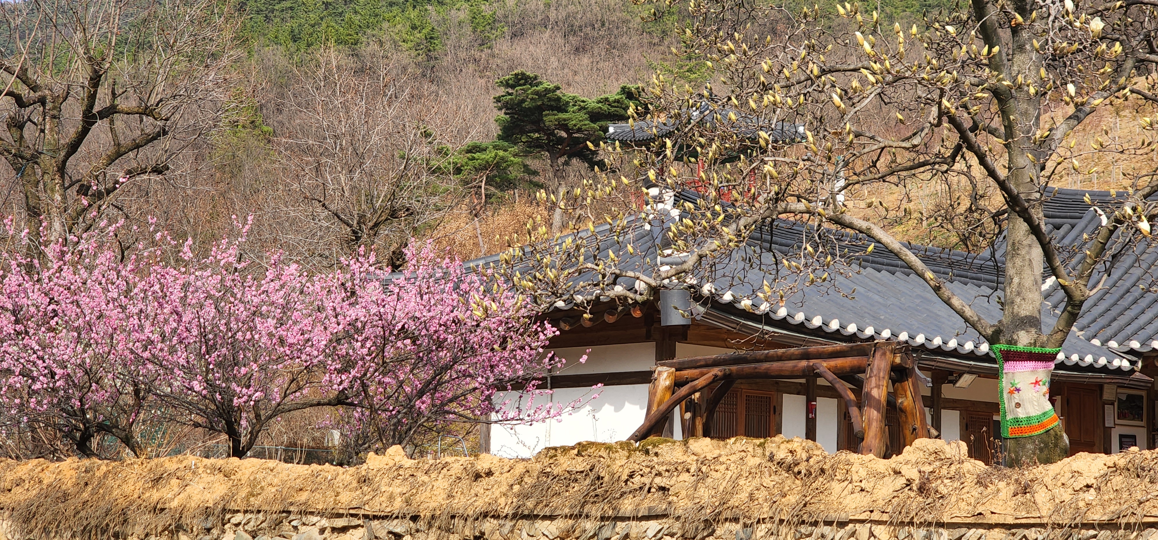 한 열흘 전(3월 6일), 옻골 마을을 갔었는데, 목련꽃 사랑에 빠진 지인을 따라 다시 올라갔다. 부동 삼거리에서 걸어서 올라가다 택시를 탔다. 그새 담장 안의 홍매화는 붉음을 뽐내고, 산수유도 노랗게 제멋에 흥겨워 하는데, 사랑하는 친구의 연인 꽃은 뾰족한 입술만 내밀고 있었다. 되돌아 나가는 시내버스가 오후 4시 40분이라 한 시간의 여유가 있었다. 지난번 둘러본 ‘백불고택’을 필두로 동계 정, 수구당, 골목을 돌아 정려 각 앞으로 내려왔다. 오후의 햇살이 고택 처마 끝으로 살포시 내려앉았다.