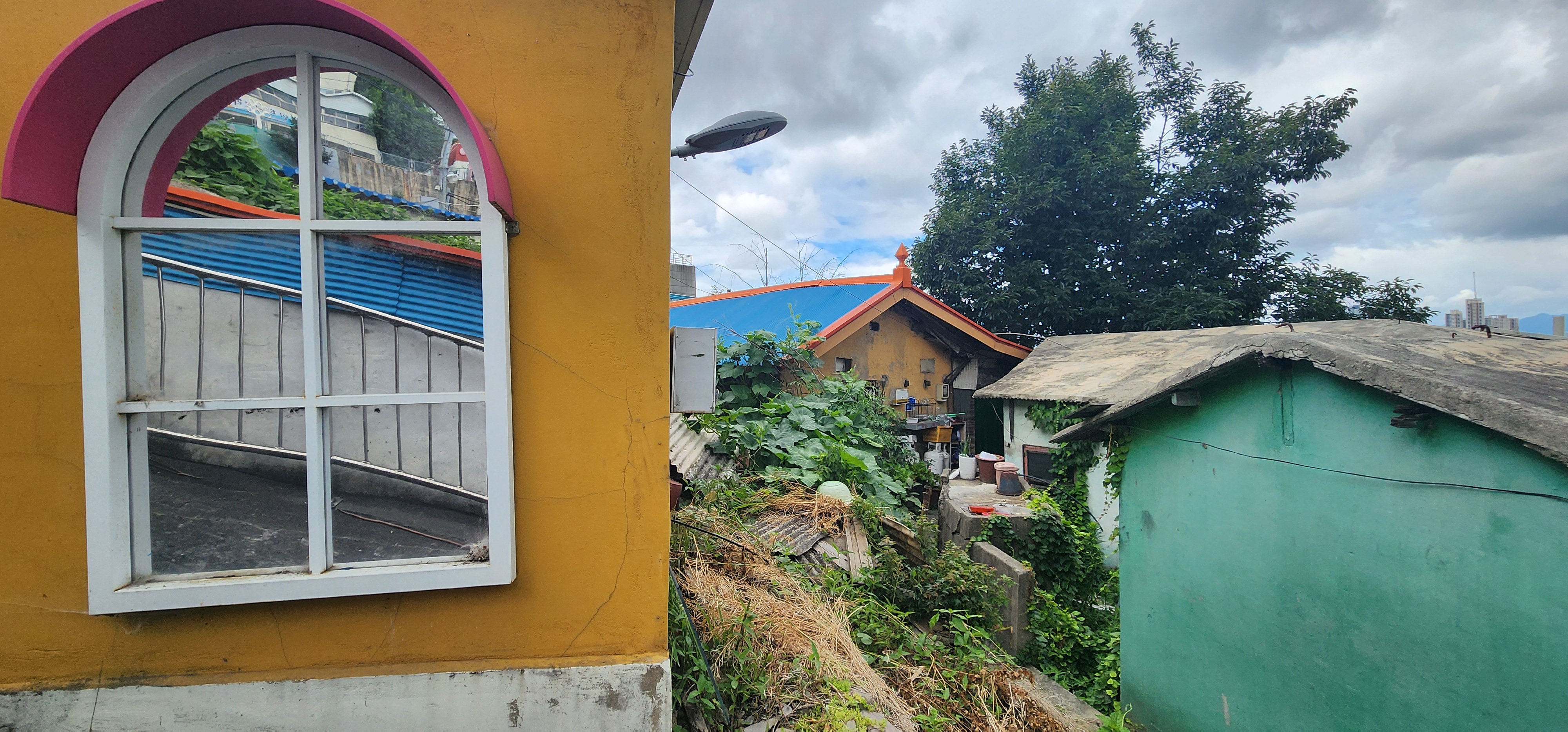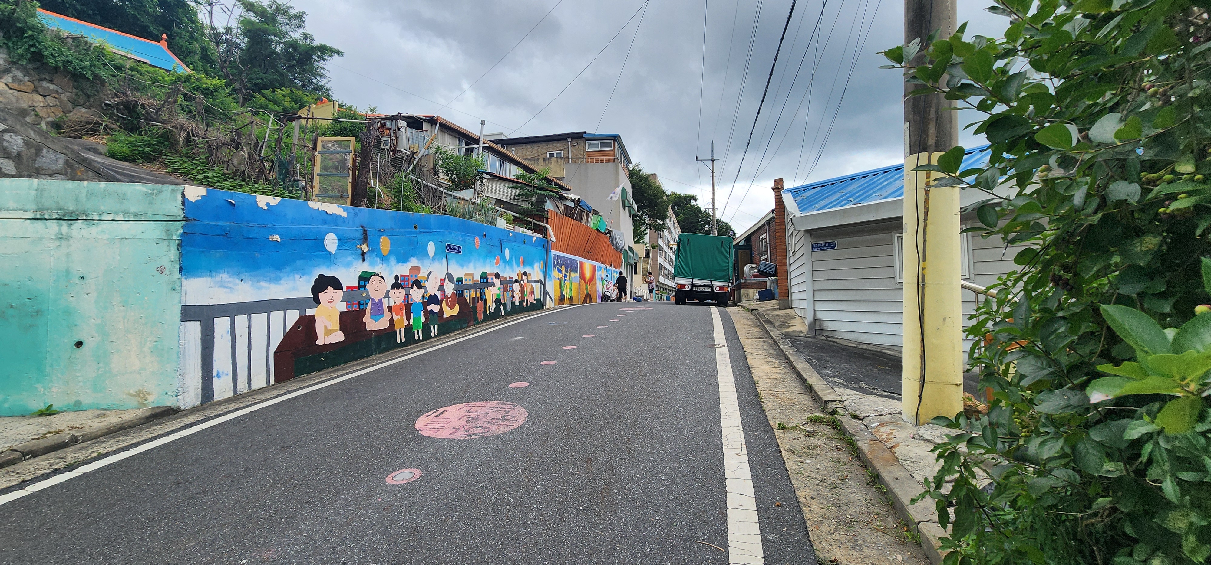 전망대에서 내려와 골목으로 들어섰다. 대동 벽화마을 골목이다. 하늘공원 마을이라 불리는데 걸맞게, 길은 마치 다랑논 둑같이 층층으로 이어진다. 옛날 골목을 걸으면 어릴 적 골목에서 뛰어놀던 추억(말뚝박기, 기차놀이, 팽이치기, 땅 빼앗기, 깡통 차기 등)들이 새록새록하다. 좁고 진(긴) 골목은 처마와 처마가 맞대고, 호롱불 희미한 봉창 너머로 도란도란하는 소리, 부모님 세대가 살아온 켜켜이 쌓인 삶의 체취를 맡는다.
