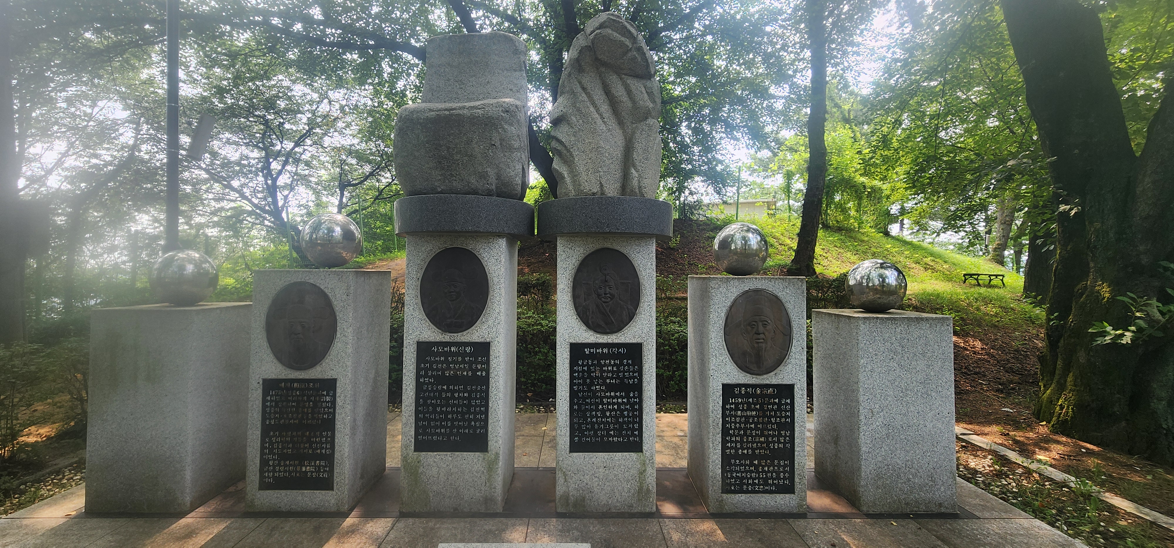 자산공원으로 올라섰다. 6.25 한국전쟁과 월남전에 참전, 조국과 세계평화에 이바지한 '무공 수훈자 전공비'를 만나고 걸음을 옮기면, 100년 김천의 역사를 흝어보는 사진이 전시되어 있다. 제29회 베이징 올림픽에서 금메달을 목에 건 최민호 (유도)선수의 당당한 기풍도 넘쳐났다. 사모 바위 조각상, 사이렌 탑, 어린이 놀이 숲을 지나 다시 자산 마을로 내려섰다.