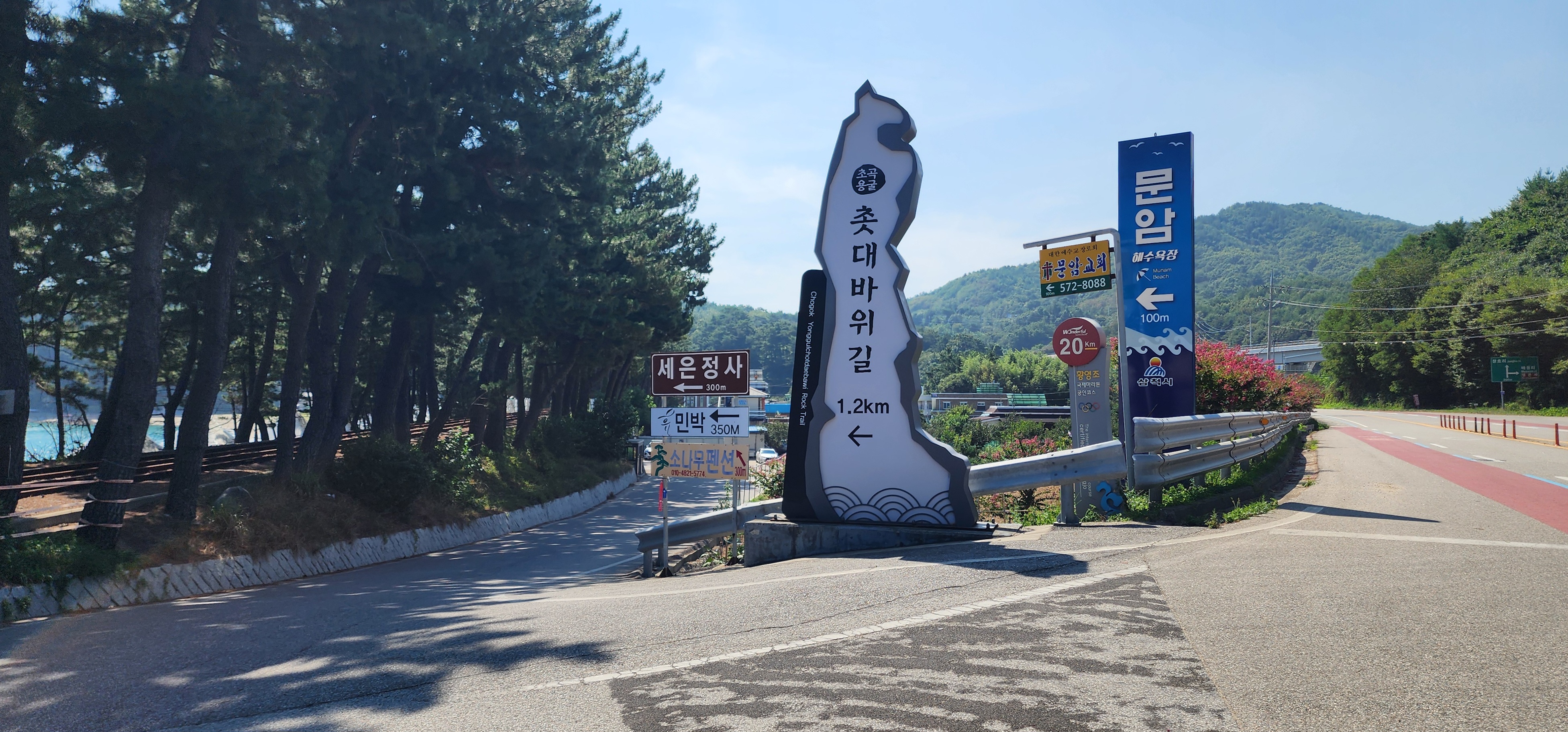 08시 59분, 평해역에서 출발한 열차는 기성, 매화, 울진, 죽변역 등을 거쳐 10시 03분에 무인 정차역인 근덕역에 멈춰섰다. 우리 부부가 플랫폼을 벗어나기 전, 열차는 저만치 산허리를 돌아가고 있었다. 썰렁한 대합실 홍보물 가판대에 꽂혀있는 삼척 도시 관광(시티투어) 팸플랫에 눈길이 갔다. 1,000원으로 즐기는 해안 코스(죽서루/09:10 탑승 -쏠비치-삼척역-근덕역/10:15 -해양 레일바이크/궁촌:중식, 도보 관광/장호항-해상 케이블카/장호-로컬 체험/중앙시장-삼척역/16:10-쏠비치/16:30 하차, 금,토요일 운행, 6,000원 결제자/삼척 사랑 상품권 5,000원 환급) 관광버스가 광장에서 출발하고, 초곡항 버스는 30여 분 뒤에 닿는다, 역사를 나와서 문암,초곡항 용굴 촛대바위 길로 발걸음을 내디뎠다. 머리맡으로 따가운 햇살이 내리비췄다.