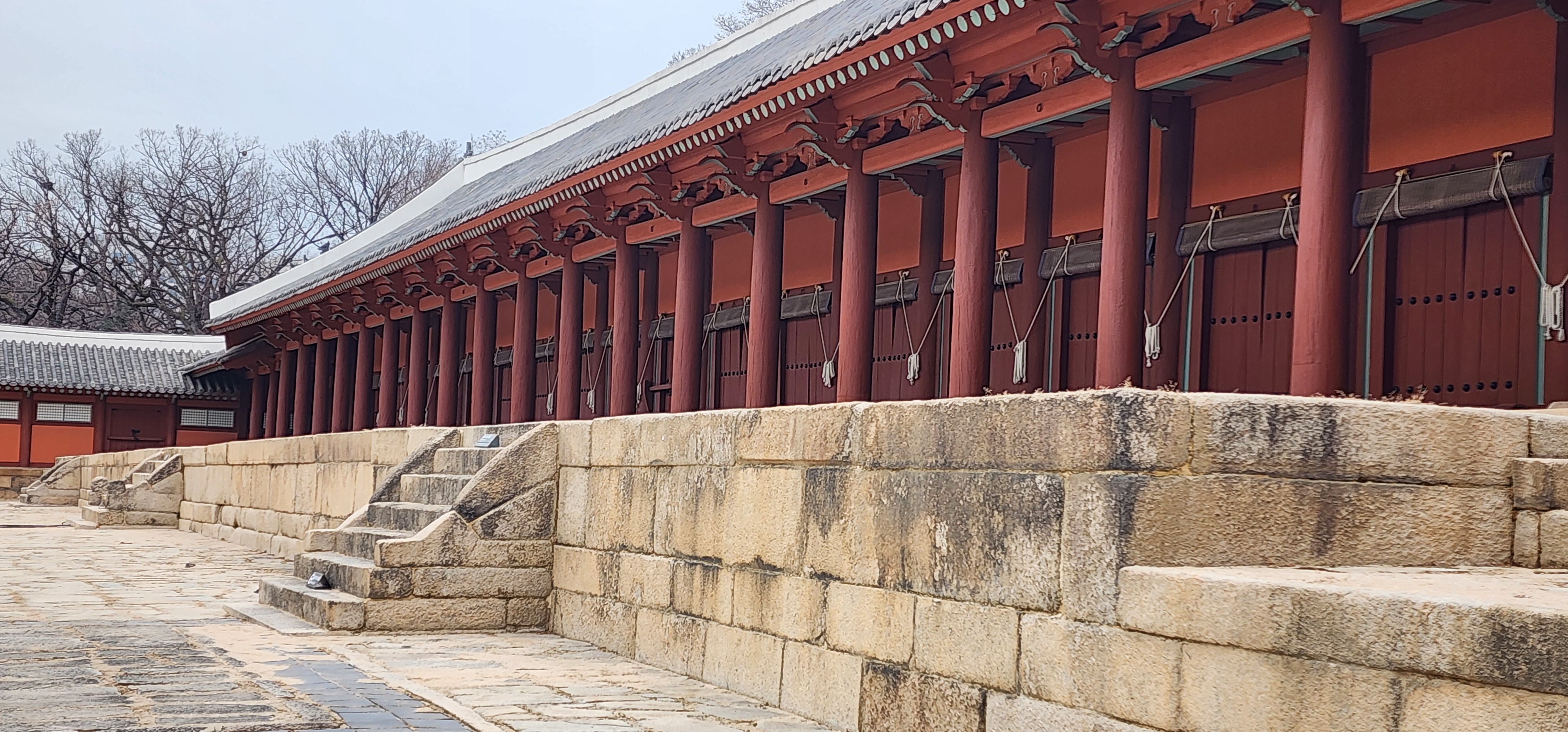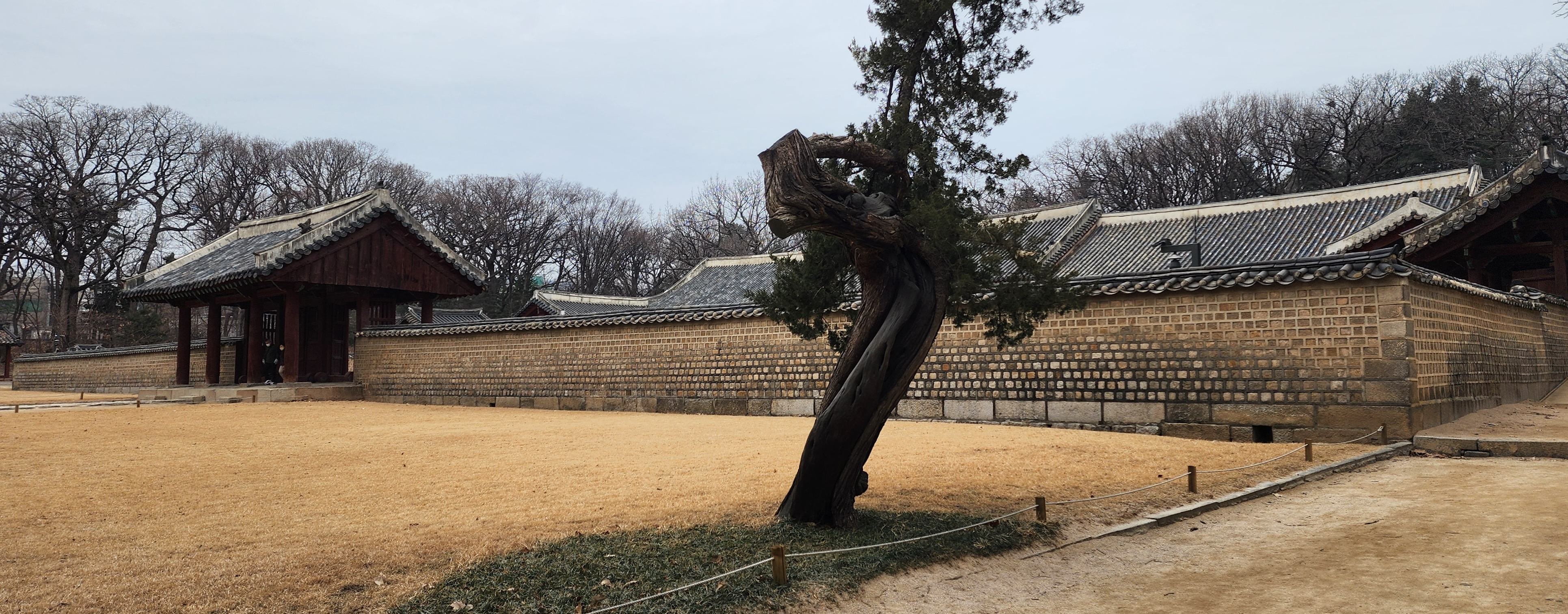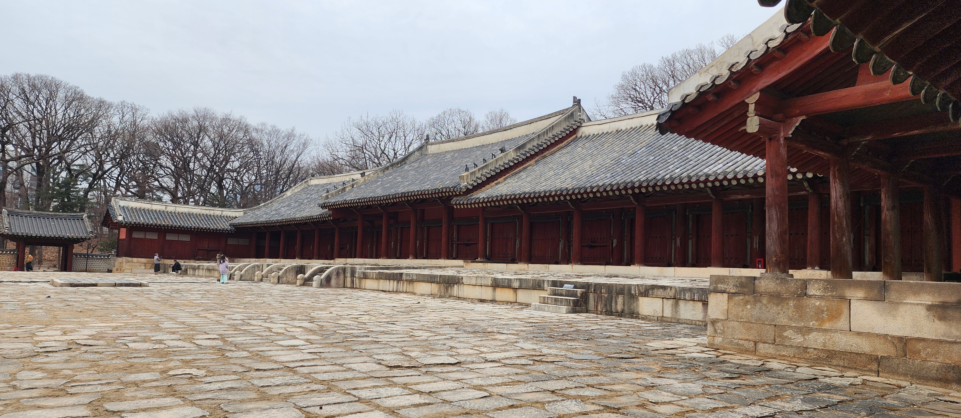 500년 조선의 왕과 왕비의 신주(혼)를 모시고 제사를 지내는 국가 사당 종묘를 둘러본다. 동 순라군의 순찰길 담벼락을 따라 외대문을 들어섰다. 울창한 나목 군상이 회색빛 하늘로 치솟아 있다. 얄은 돌로 깐 삼도(三道: 신로(神路)/중앙, 세자(世子)의 길/좌, 왕(王)의 길/우)가 저 멀리 뻗어있다.