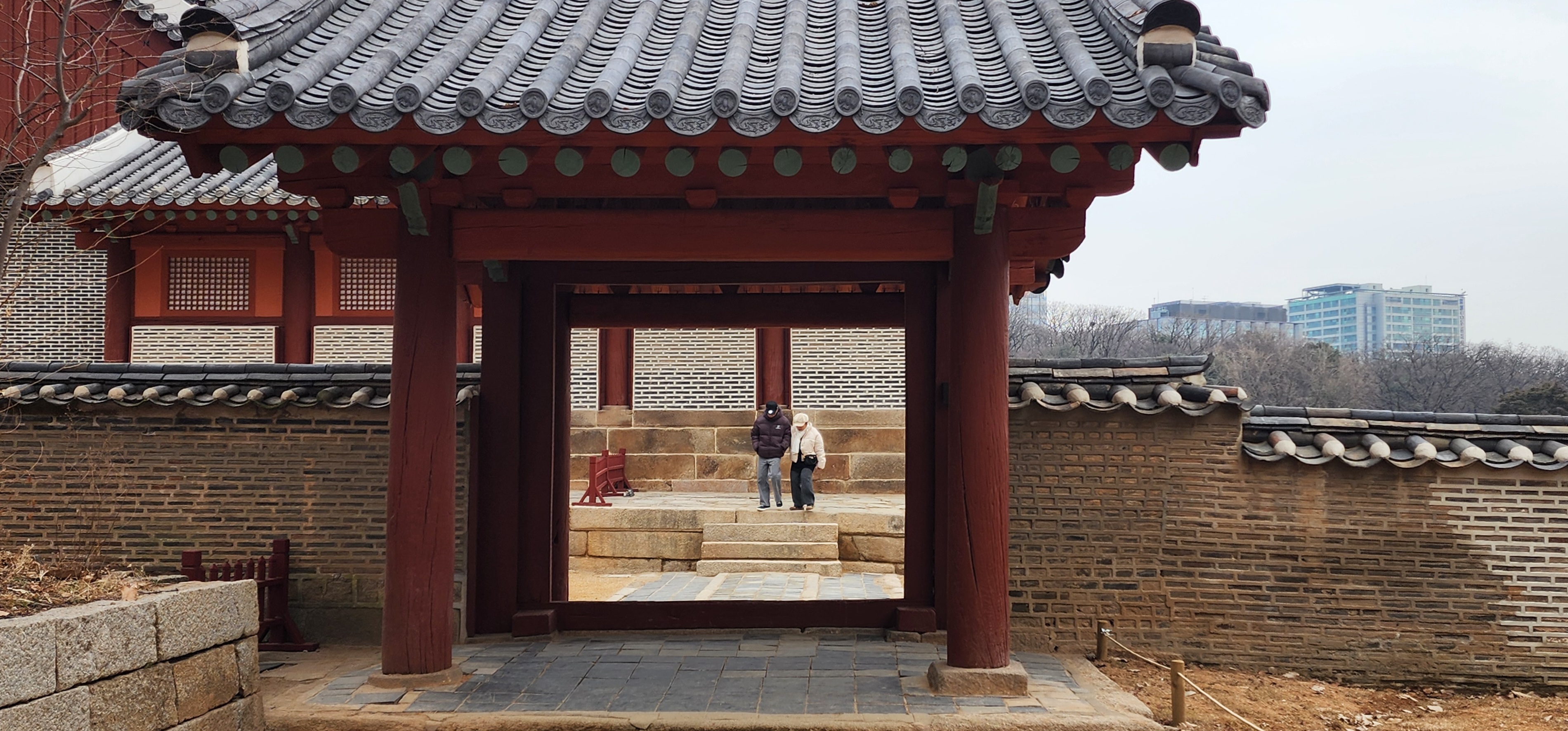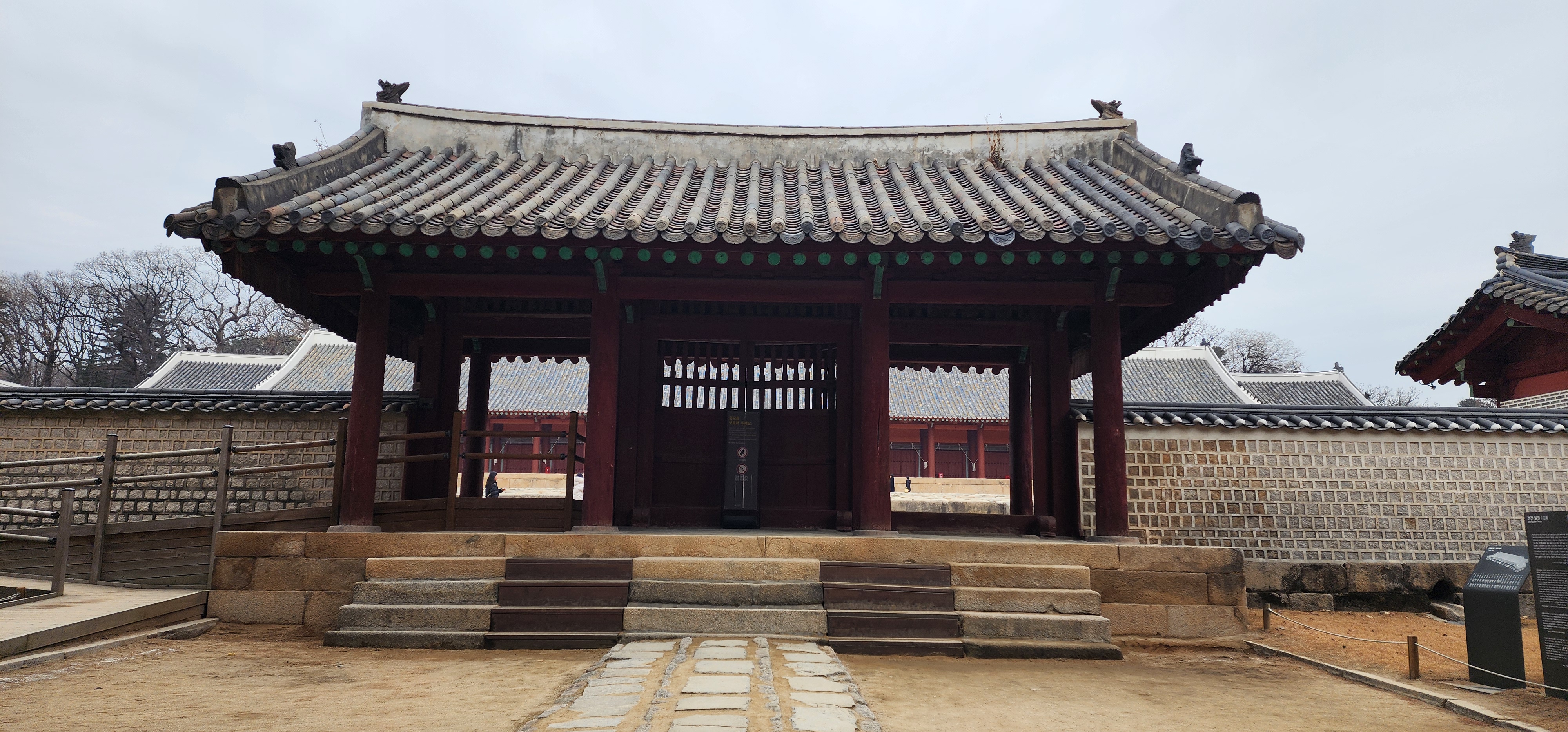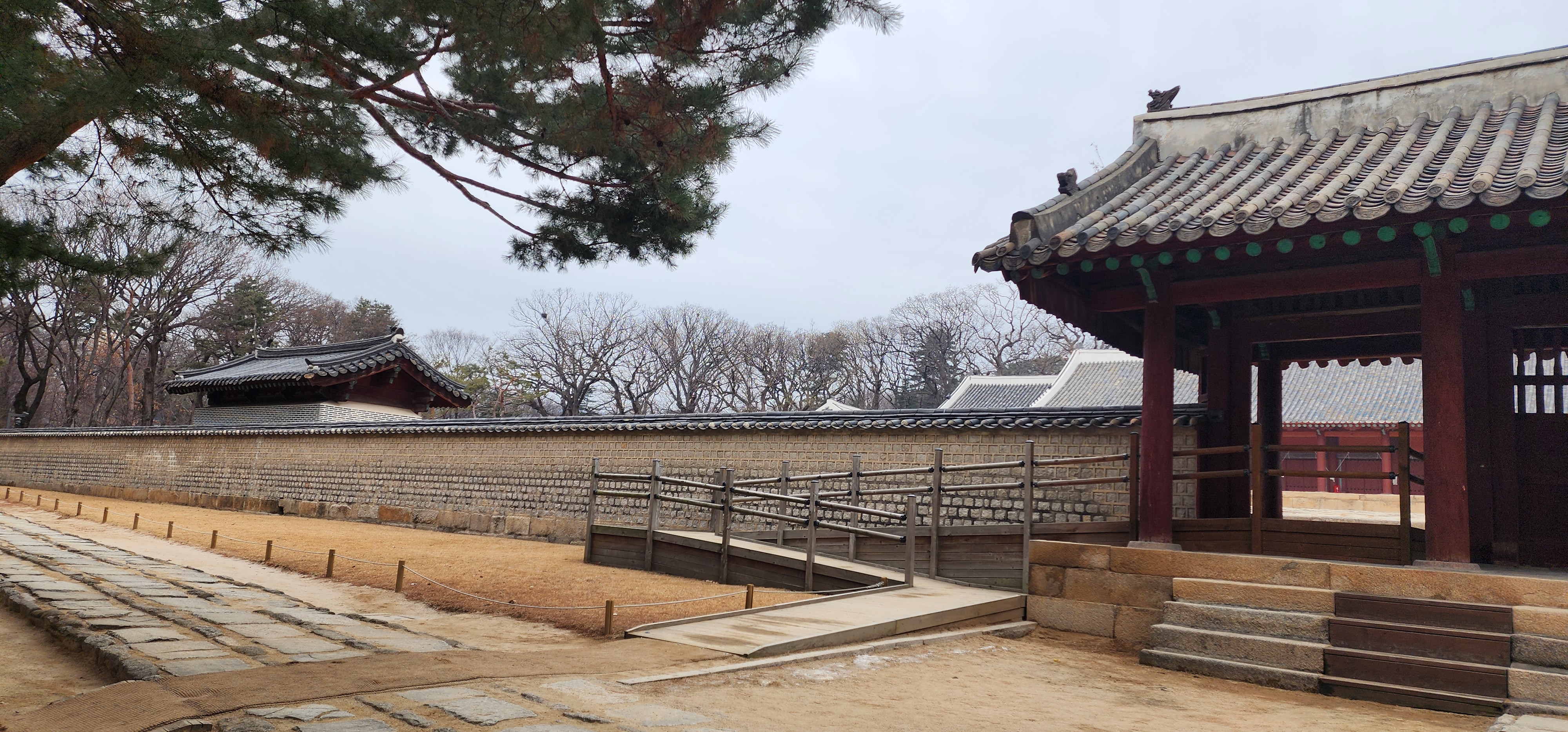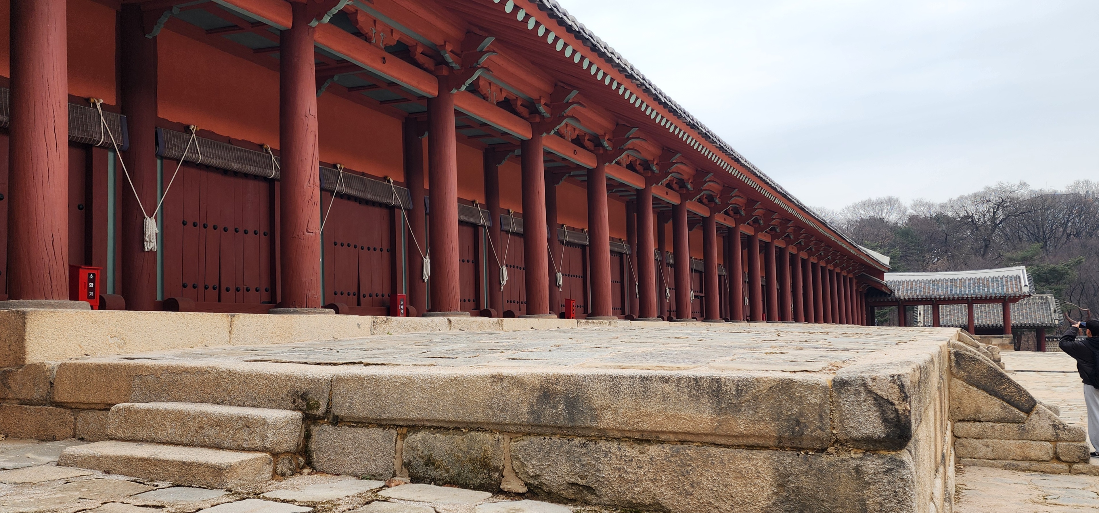 500년 조선의 왕과 왕비의 신주(혼)를 모시고 제사를 지내는 국가 사당 종묘를 둘러본다. 동 순라군의 순찰길 담벼락을 따라 외대문을 들어섰다. 울창한 나목 군상이 회색빛 하늘로 치솟아 있다. 얄은 돌로 깐 삼도(三道: 신로(神路)/중앙, 세자(世子)의 길/좌, 왕(王)의 길/우)가 저 멀리 뻗어있다.